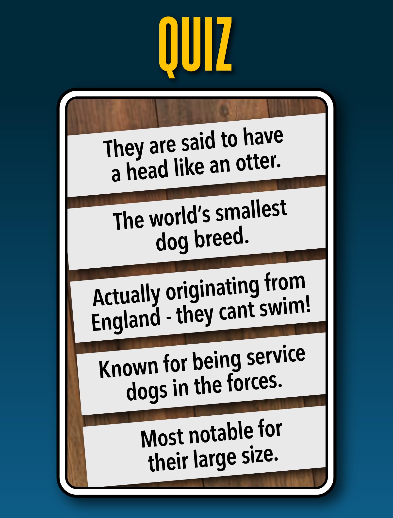 - ENTERTAINING AND EDUCATING - Enables learning by matching of pictures and names of 25 dogs in groups e.g. Weight, Intelligence, Trainability. Learning fun facts about those dogs, such as; weight, lifespan and much more trivia!